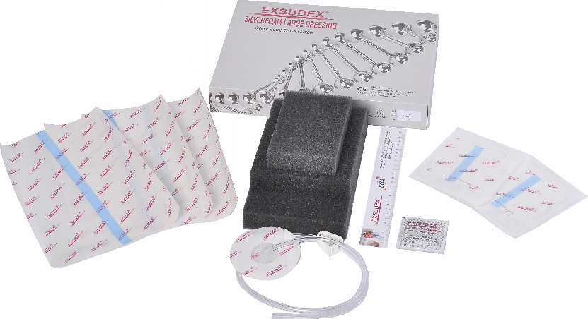 Vakum yardımlı yara tedavisinde etkin tedavi yöntemi sunan Exsudex, gümüşlü kapama setleri içerisinde bulunan poliüretan süngerler, kanıtlanmış güvenli ve etkili patentli ‘’Gümüş’’ teknolojisi ile üretilmiştir.